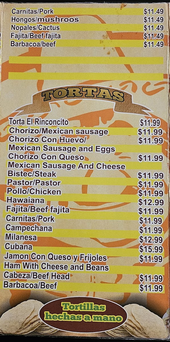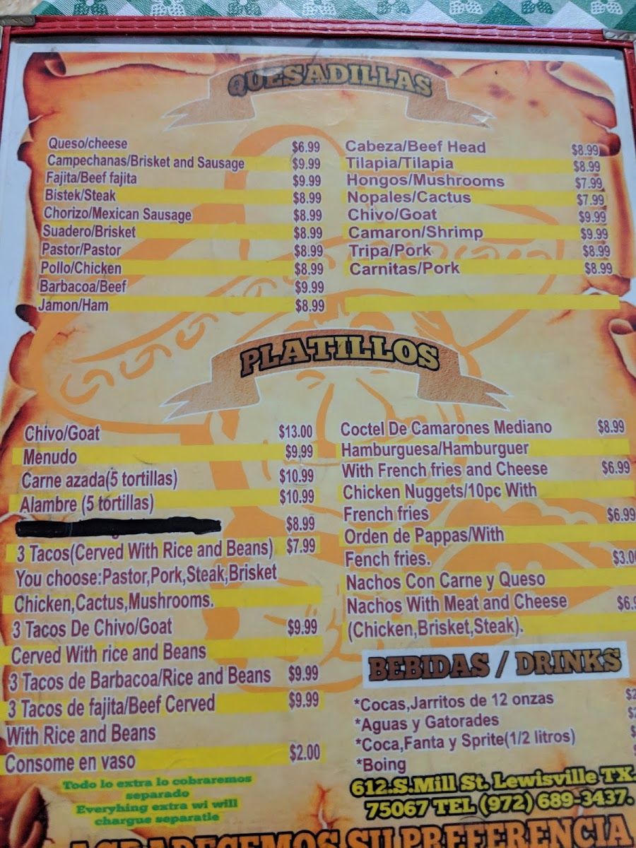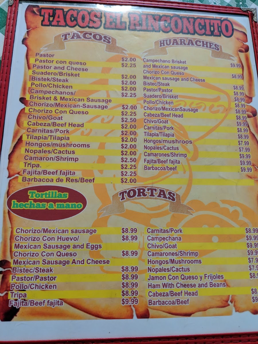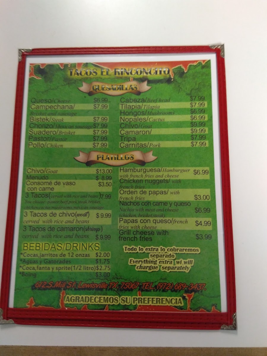 Introducing the menu at Tacos El Rinconcito, a hidden gem located in Lewisville, TX, where authentic Mexican flavors come alive. The menu showcases a vibrant array of tacos, including traditional options like Tacos De Lengua and Tacos De Tripa, alongside flavorful seafood offerings such as Camarones A La Diabla and Plato De Ceviche.